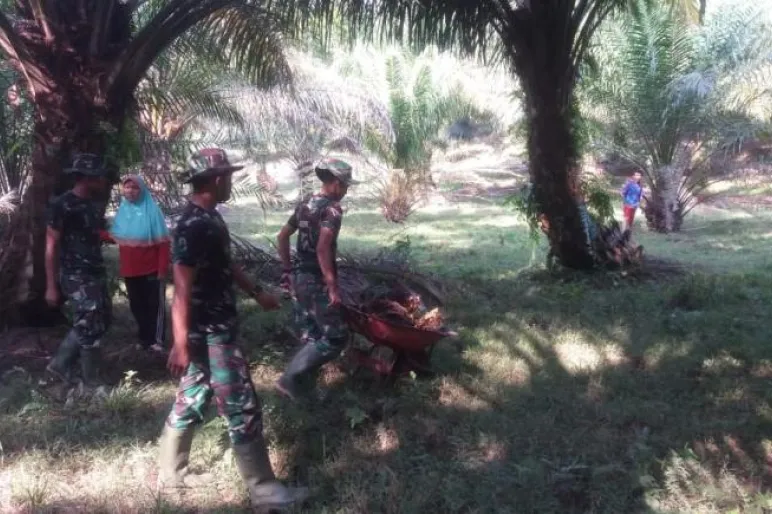 Anggota Satgas TMMD Ke-105 Kodim 0407 Bengkulu, Bantu Warga Panen Sawit di Kebun