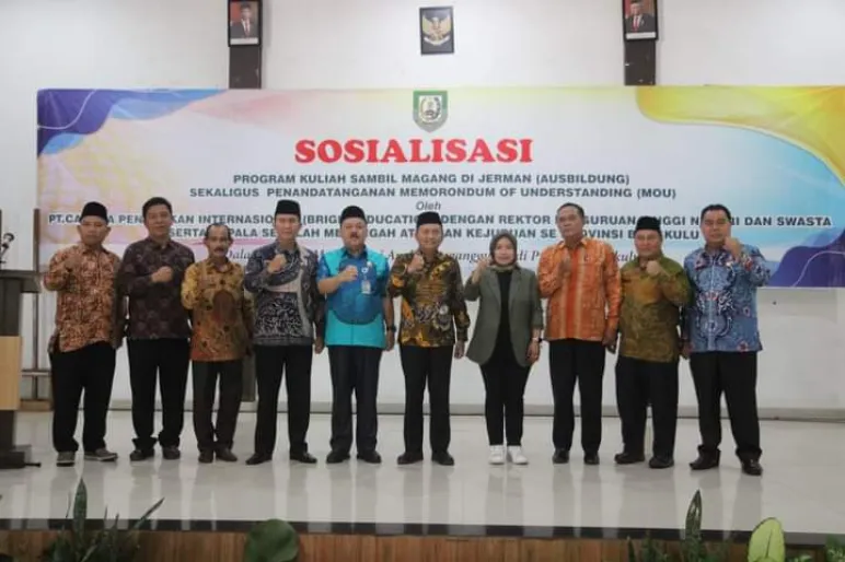 “Pola pendidikan di Jerman itu beda 30 persen dari teori 70 persen praktik. Ini perlu diikuti oleh anak-anak Bengkulu,” cetus Hamka. Penandatanganan MoU dengan SMA/SMK dan Perguruan Tinggi se-Provinsi Bengkulu dihadiri ini, selain dihadiri Sekda Provinsi Bengkulu yang mewakili Gubernur Bengkulu Dr. Rohidin Mersyah, Kadis Ketenagakerjaan dan Transmigrasi Provinsi Bengkulu, Ketua PGRI Provinsi Bengkulu, dewan Provinsi Bengkulu, Para Pimpinan Bank Nasional dan Bank Daerah, Rektor Universitas Negeri dan Swasta serta Kepala SMA/SMK se-Provinsi Bengkulu.