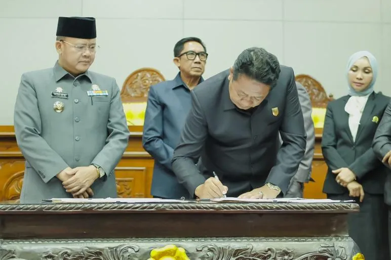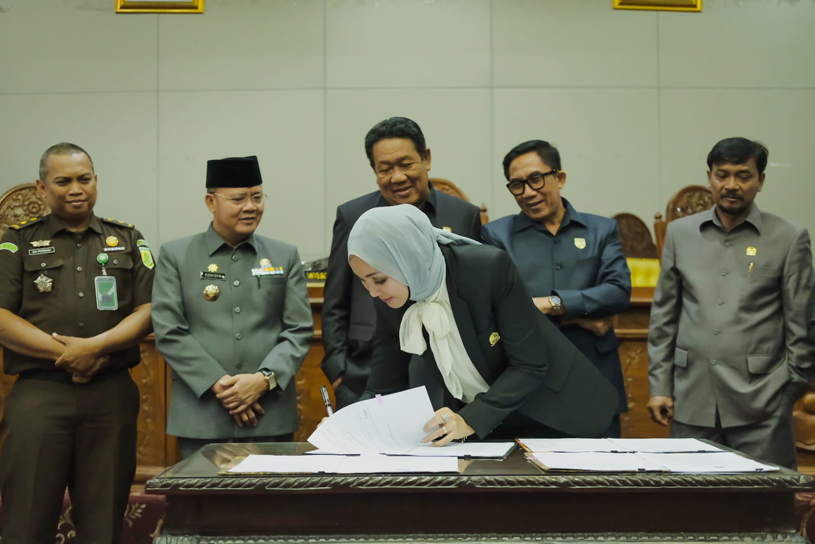 Setelah itu, dilanjutkan dengan penandatanganan persetujuan bersama atas dua Raperda yang disetujui untuk disahkan menjadi Perda yang ditandatangani oleh unsur pimpinan dewan provinsi serta Gubernur Bengkulu Rohidin Mersyah, di Ruang Rapat Paripurna DPRD Provinsi Bengkulu.