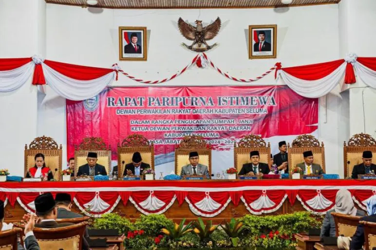 TEROPONGPUBLIK.CO.ID <<<>>> Suasana khidmat menyelimuti Gedung Paripurna DPRD Kabupaten Seluma pada Jumat (22/08/2025), saat digelar Rapat Paripurna Istimewa dengan agenda pengambilan sumpah dan janji Ketua DPRD Kabupaten Seluma masa jabatan 2025–2029. Bupati Seluma, Teddy Rahman, SE., MM, hadir langsung dalam acara penting tersebut untuk memberikan dukungan atas terbentuknya kepemimpinan baru di lembaga legislatif daerah.