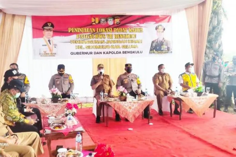 SELUMA.TEROPONGPUBLIK.CO.ID>><< Bupati Seluma Erwin Octavian, SE mendampingi Gubernur Bengkulu Rohidin Mersyah bersama Kapolda Bengkulu Irjen. Pol. Guntur Setyanto, melakukan peninjauan padat karya Program Percepatan Peningkatan Tata Guna Air Irigasi (P3-TGAI), serta ke lokasi proyek Pembangunan Jaringan Irigasi di Dusun Batuan, Kelurahan Sidomulyo, Kecamatan Seluma Selatan, Senin (21/9/2021).