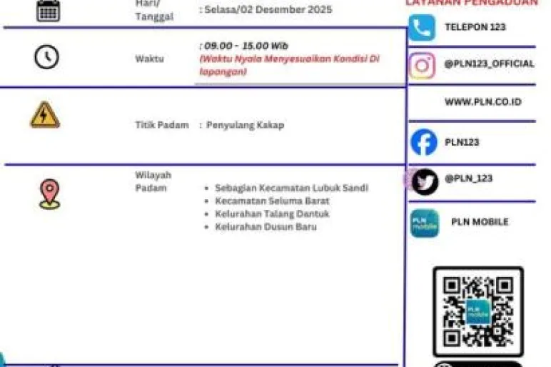 Perusahaan Listrik Negara (PLN) Unit Layanan Pelanggan (ULP) Tais mengumumkan rencana pemadaman listrik terjadwal di beberapa wilayah Kabupaten Seluma. Kebijakan ini diambil sebagai bagian dari program pemeliharaan jaringan guna meningkatkan keandalan pasokan listrik bagi masyarakat. Dalam keterangannya, PLN menyampaikan bahwa kegiatan pemeliharaan menjadi langkah penting untuk memastikan infrastruktur kelistrikan tetap berfungsi optimal serta mencegah terjadinya gangguan yang lebih besar di kemudian hari.Adapun wilayah yang akan terdampak pemadaman listrik meliputi sebagian Kecamatan Lubuk Sandi, Kecamatan Seluma Barat, Kelurahan Talang Dantuk, serta Kelurahan Dusun Baru. Keempat wilayah tersebut dipilih berdasarkan prioritas kerja teknis yang telah disusun oleh tim PLN, terutama pada titik-titik jaringan yang membutuhkan pemeriksaan, perawatan, dan penggantian komponen.