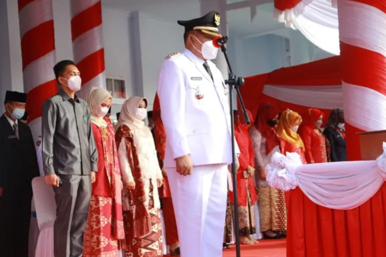 SELUMA.TEROPONGPUBLIK.CO.ID>><< Bupati Seluma Erwin Octavian, SE. Bertindak sebagai Inspektur Upacara Peringatan Hari Ulang Tahun Ke-76 Republik Indonesia yang dilaksanakan di Halaman Gedung Daerah Serasan Seijoan Seluma, Selasa (17/8/2021).