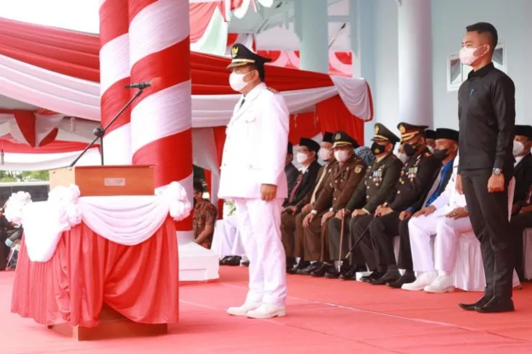 SELUMA.TEROPONGPUBLIK.CO.ID>><< Wakil Bupati Seluma Drs. Gustianto bertindak sebagai Inspektur Upacara pada Penurunan Bendera Merah Putih yang digelar di halaman Gedung Daerah Serasan Seijoan Seluma, Selasa (17/8/2021) sore.