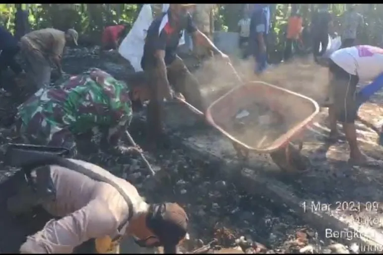 Hari ini kita lakukan gotong royong bersama warga bersihkan puing-puing bangunan dan yang lainnya dari sisa kejadian kebakaran kemaren, ujar Iptu M.Tri