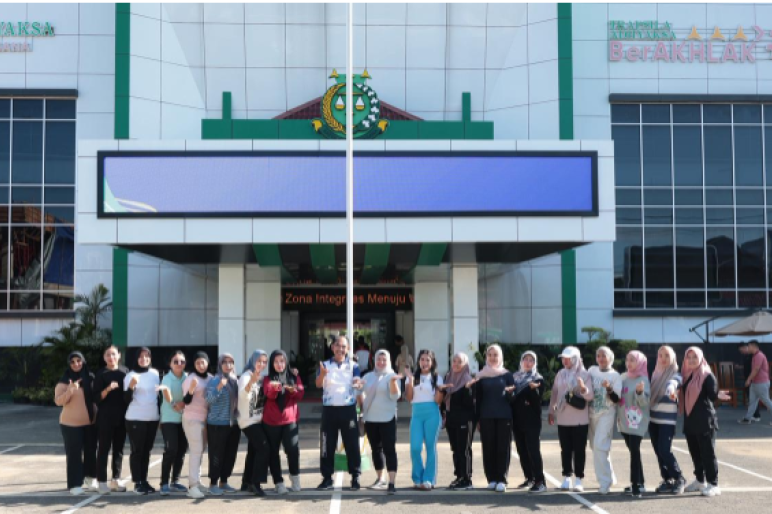 Suasana kegiatan berlangsung penuh semangat. Musik pengiring senam membuat peserta terlihat antusias mengikuti setiap gerakan yang dipandu oleh instruktur. Beberapa pegawai tampak saling menyemangati dan tertawa bersama, menciptakan suasana hangat dan kekeluargaan yang jarang terlihat di tengah kesibukan rutinitas kantor.