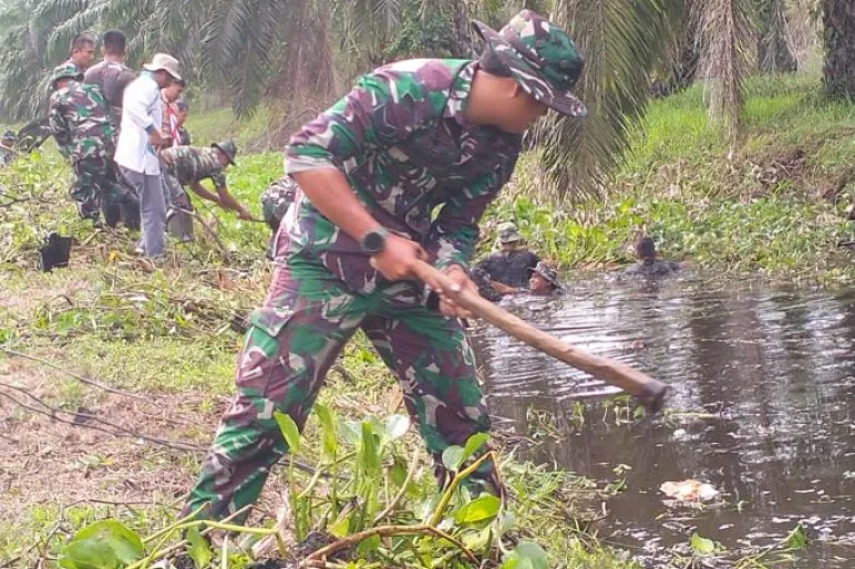 Terlihat Prajurit TNI dari Kodim 0428/MM dan Personel Polres Mukomuko berbaur bersama masyarakat dan pemerintah setempat membersihkan sampah dan eceng gondok Aliran Sungai Batang Air Kecil Madyara yang berada di RT 3 Desa Ujung Padang Mukomuko.