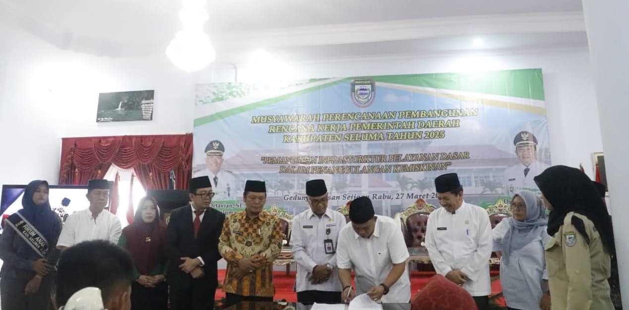 TEROPONGPUBLIK.CO.ID <<>> Bupati Seluma, Erwin Octavian, SE, mengawali Musyawarah Perencanaan Pembangunan (Musrenbang) RKPD Kabupaten Seluma Tahun 2025 pada Rabu (27/3/2024) di Gedung Daerah Serasan Seijoan Seluma. Acara ini dihadiri oleh Forkopimda, Kepala Bappeda Provinsi Bengkulu, DPRD Provinsi Bengkulu, Sekretaris Daerah Kabupaten Seluma, Asisten dan Staf Ahli, Kepala OPD, Kepala Bappeda Kabupaten Empat Lawang, Kepala Bappeda Kota Bengkulu, Camat se-Kabupaten Seluma, Kades, dan Lurah se-Kabupaten Seluma.