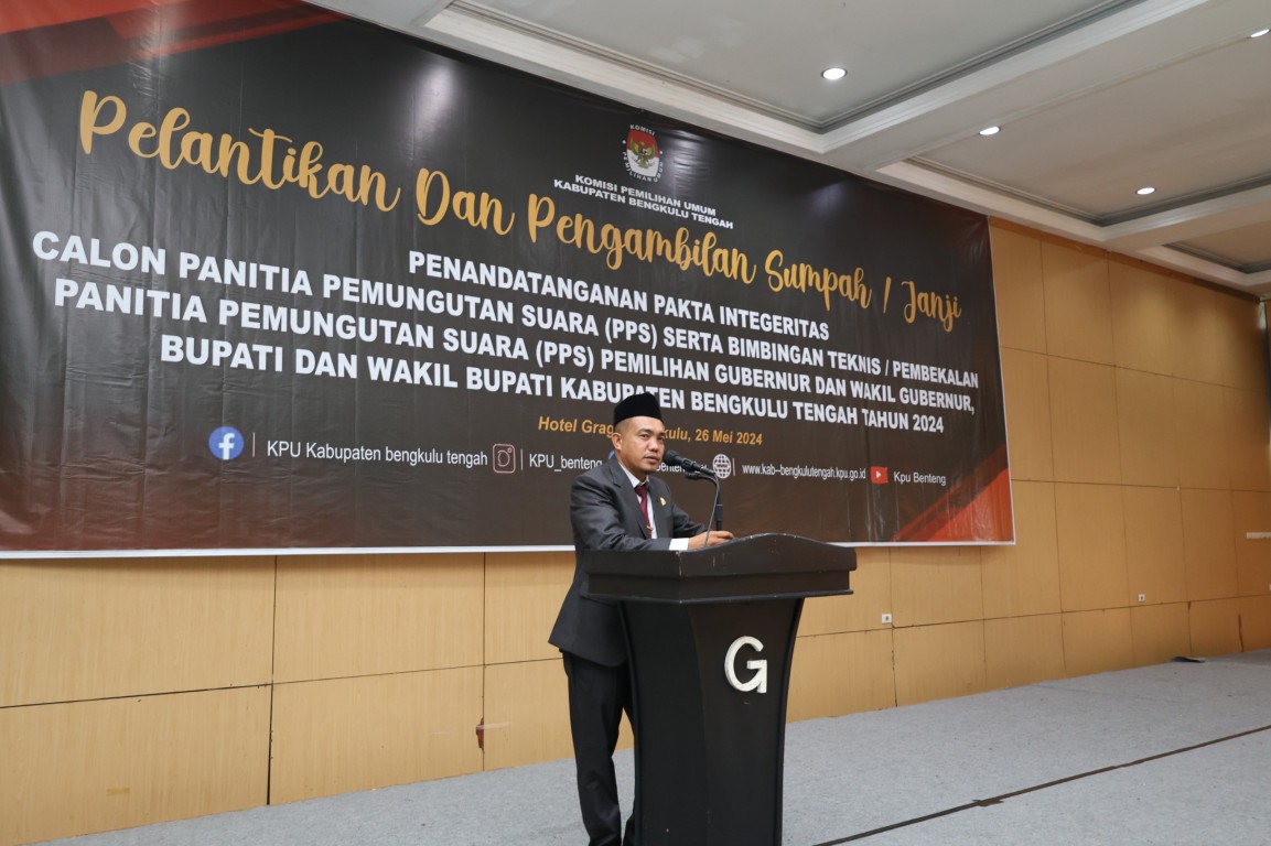 TEROPONGPUBLIK.CO.ID <<<>>> Pemerintah Kabupaten Bengkulu Tengah, yang diwakili oleh Sekretaris Daerah Drs. Rachmat Riyanto, S.T., M.AP., menghadiri pelantikan dan pengambilan sumpah anggota Panitia Pemungutan Suara (PPS) untuk Pemilihan Gubernur/Wakil Gubernur, Bupati/Wakil Bupati, dan Walikota/Wakil Walikota tahun 2024. Acara ini berlangsung di Ballroom Hotel Grage Horizon Bengkulu pada Minggu, 26 Mei 2024.