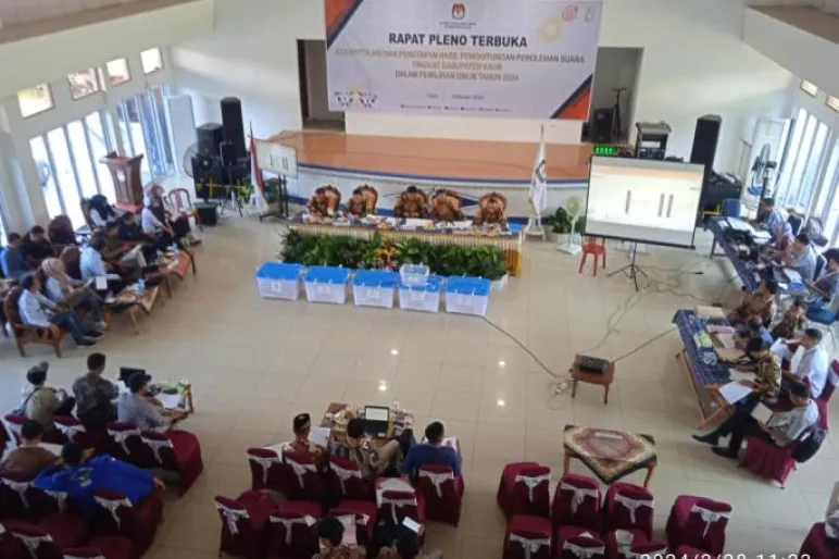 TEROPONGPUBLIK.CO.ID >><< Komisi Pemilihan Umum Daerah (KPUD) Kabupaten Kaur kembali menggelar rapat pleno terbuka untuk merekapitulasi hasil penghitungan perolehan suara Pemilihan Umum (Pemilu) tahun 2024. Rapat tersebut dilaksanakan pada hari kedua di Gedung Serba Guna (GSG) Pemerintah Daerah Kabupaten Kaur, Rabu (28/2/2024).