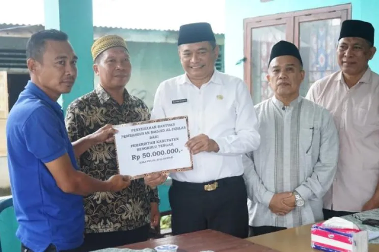 TEROPONGPUBLIK.CO.ID >><< Sekretaris Daerah Bengkulu Tengah, Drs. Rachmat Riyanto, S.T., M.AP., melaksanakan serah terima bantuan dana rehabilitasi untuk Masjid Al-Ikhlas di Desa Padang Betuah, Kecamatan Pondok Kelapa. Acara tersebut turut dihadiri oleh Kabag Kesra Setda Bengkulu Tengah, Wattiulah, M.Pd., beserta jajaran, dan diterima langsung oleh Kepala Desa Talang Pauh bersama Panitia Pembangunan Masjid.Kamis (18/1).