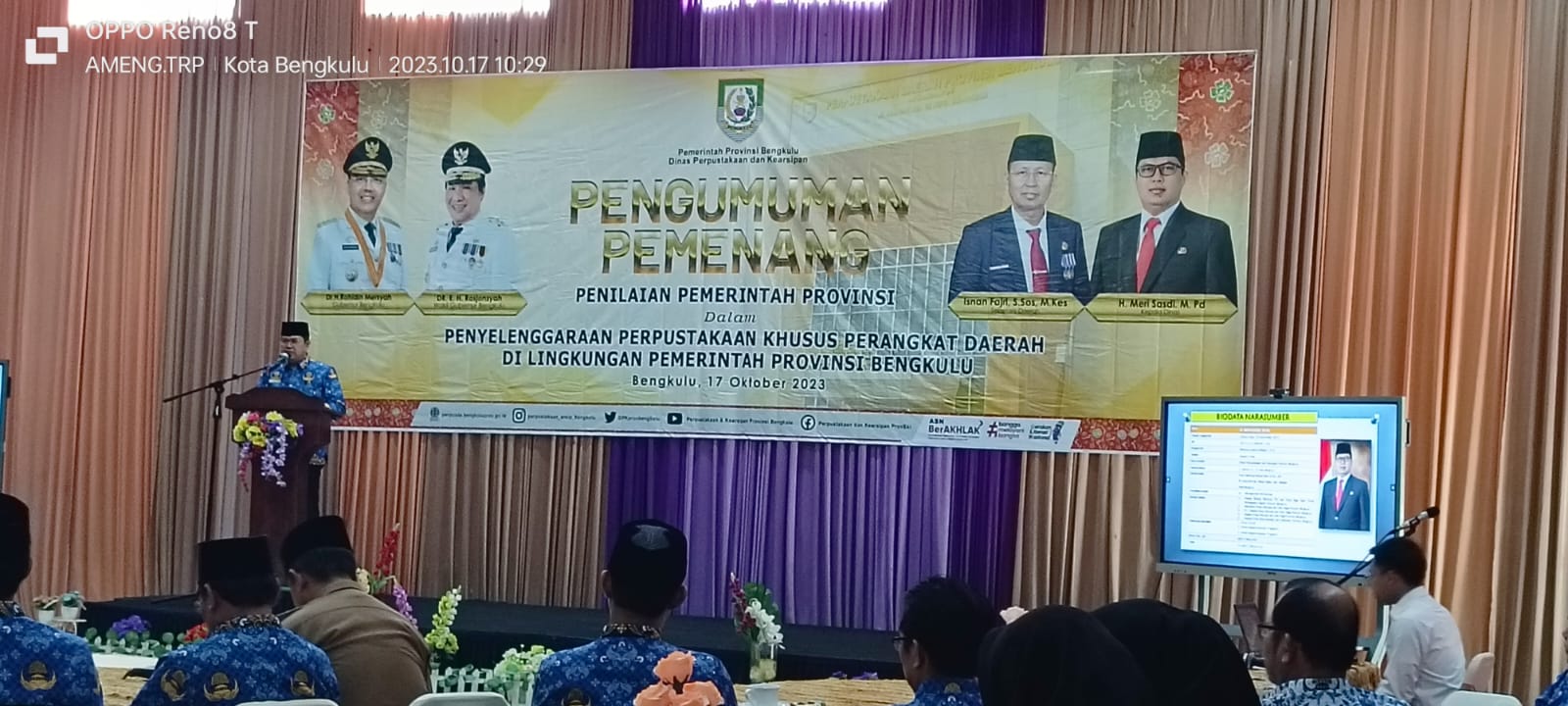 Teropongpublik.co.id >><< Dinas Perpustakaan dan Kearsipan Provinsi Bengkulu menggelar acara istimewa di Hotel Grand Bougenville, Pantai Panjang, Kota Bengkulu. Acara tersebut adalah penyerahan hadiah kepada pemenang dalam penyelenggaraan Perpustakaan Khusus Perangkat Daerah di lingkungan pemerintahan Provinsi Bengkulu. Acara ini menjadi momentum bersejarah bagi para pegiat perpustakaan daerah dalam meningkatkan kualitas layanan perpustakaan di wilayah provinsi Bengkulu.Selasa.17/10/2023.