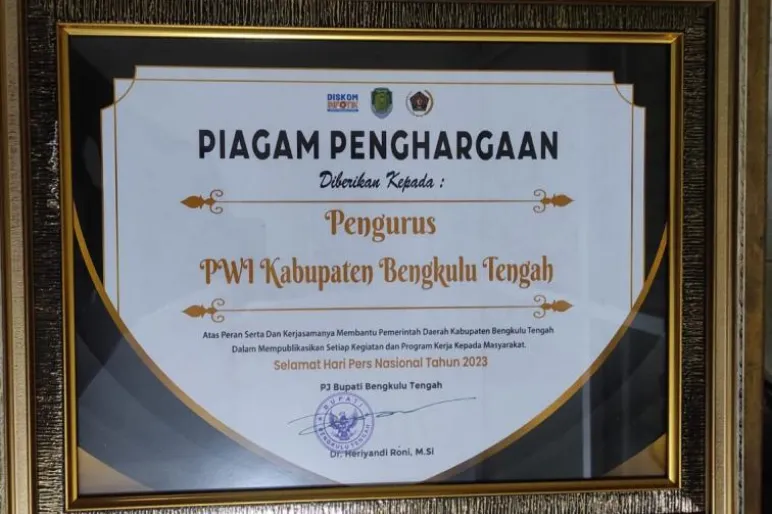 TEROPONGPUBLIK.co.id >><< PJ Bupati Bengkulu Tengah Dr.Heriyandi Roni,M.Si menyerahkan piagam penghargaan kepada Persatuan Wartawan Indonesia (PWI) Bengkulu Tengah, sebagai bentuk penghargaan kemitraan yang selama ini terjalin dengan sangat baik.