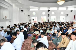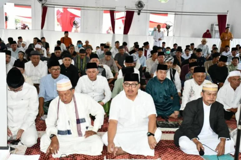 TEROPONGPUBLIK.CO.ID <<<>>> Penjabat (Pj) Walikota Bengkulu, Arif Gunadi, bersama unsur Forkopimda dan jajaran Pemerintah Kota Bengkulu, mengikuti salat Idulfitri 1445 H di Masjid Merah Putih, Kelurahan Pekan Sabtu, Kecamatan Selebar, pada Rabu (10/4).