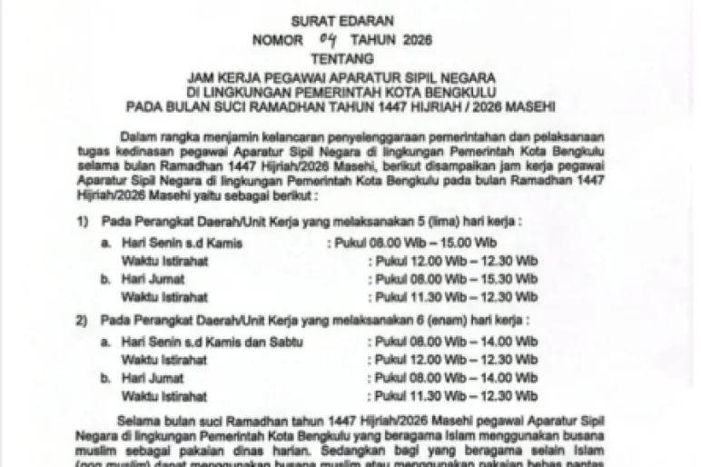 Ketentuan ini tertuang dalam Surat Edaran Nomor 04 Tahun 2026 yang diteken oleh Penjabat Sekretaris Daerah Kota Bengkulu, Medy Pebriansyah. Dalam edaran tersebut ditegaskan bahwa perubahan jam kerja bersifat sementara selama bulan Ramadan dan wajib dipatuhi oleh seluruh perangkat daerah.