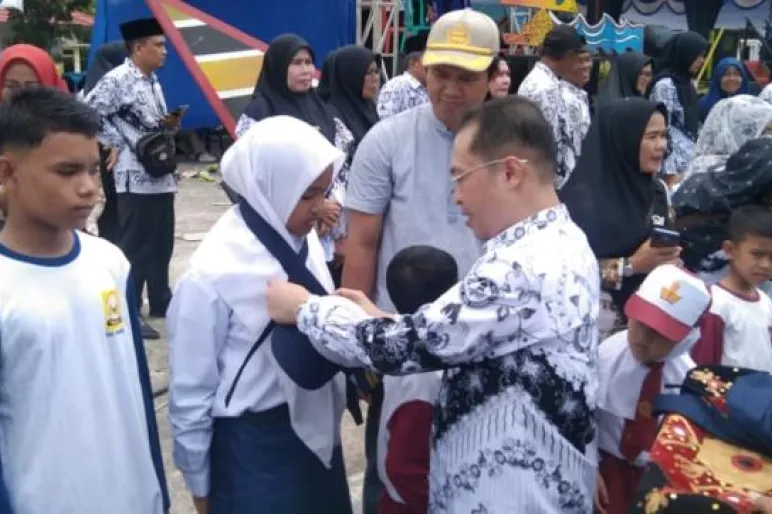 ” Ayo sekolah Negeri, karena pada hari ini sekolah negeri kita cukup turun jumlah siswanya, mudah mudahan dengan diberikan bantuan seragam gratis ini (seragam sekolah dan olahraga) mampu membuat mereka (anak anak sekolah) merasa senang dan bahagia,” imbuh Bupati.