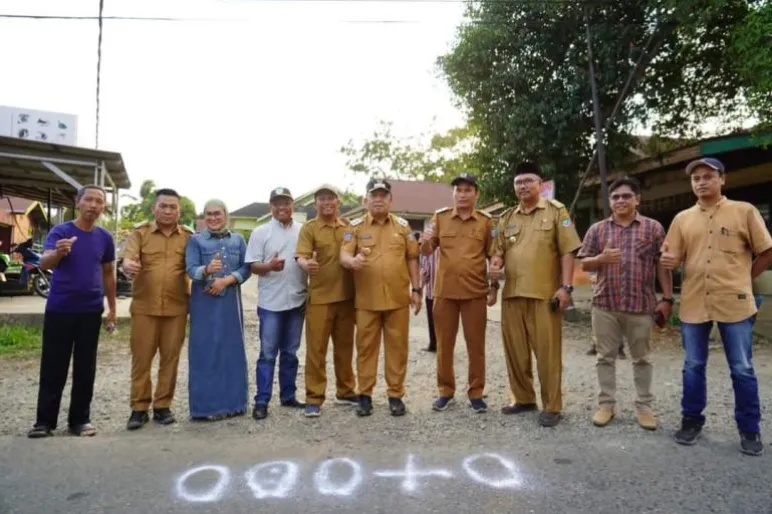 TEROPONGPUBLIK.CO.ID-Wakil Bupati Seluma Drs. Gustianto didampingi Kepala Dinas PUPR M. Syaifullah, SE, M.Si memberi tiga tanda titik nol dimulainya pembangunan jalan, Senin (25/9/23).