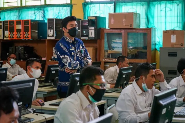 BENGKULU UTARA.TEROPONGPUBLIK.CO.ID>><< Wakil Bupati Bengkulu Utara Arie Septia Adinata turut mendampingi Kadis Pendidikan, Agus Haryanto meninjau langsung pelaksanaan ujian seleksi pegawai pemerintah dengan perjanjian kerja (P3K) untuk formasi guru, Arga Makmur, Kamis (16/9/2021).
