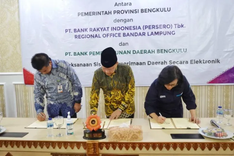 BENGKULU.TEROPONGPUBLIK.CO.ID >><< Gubernur Bengkulu Rohidin Mersyah menandatangani kesepakatan bersama antara Pemerintah Provinsi Bengkulu dengan PT. Bank Rakyat Indonesia (Persero) Tbk. Regional Office Bandar Lampung dan PT. Bank Pembangunan Daerah Bengkulu tentang Pelaksanaan Sistem Penerimaan Daerah secara Elektronik di Provinsi Bengkulu.