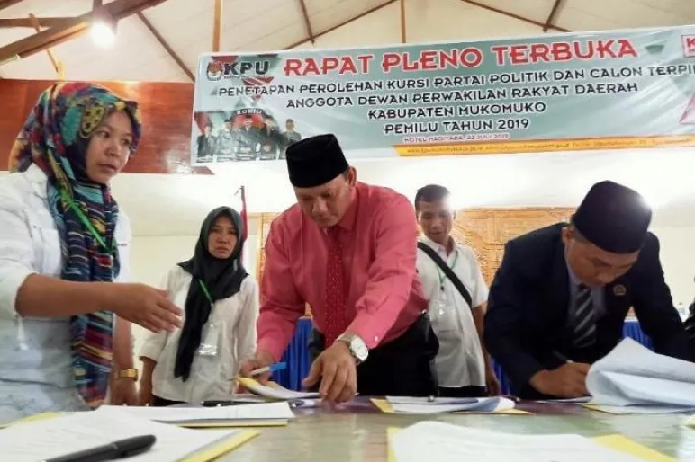 MUKOMUKO,TEROPONGPUBLIK.COM>><< Komisi Pemilihan Umum (KPU) Mukomuko, Senin siang (22/7) menggelar pleno Penetapan Perolehan Kursi Partai Politik dan Calon Terpilih Anggota Dewan Perwakilan Rakyat Daerah Kabupaten Mukomuko Pemilu 2019 lalu, di salah satu hotel di Kota Mukomuko.
