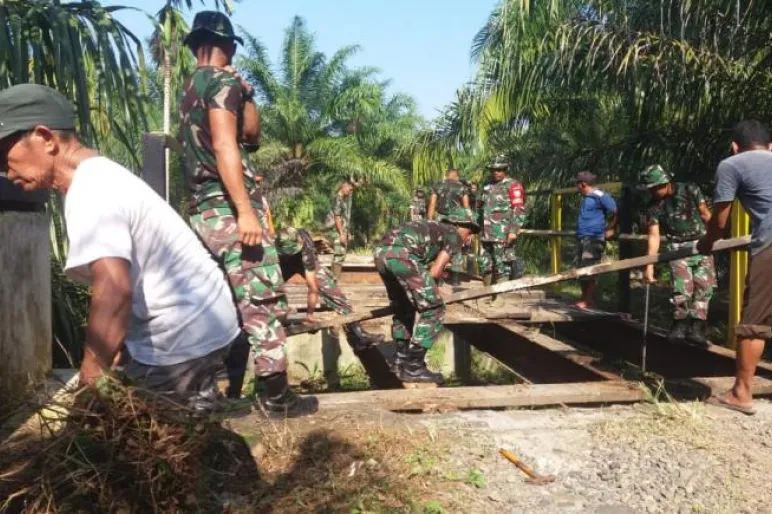 KOTA BENGKULU.TEROPONGPUBLIK.COM- Anggota Satgas TMMD Kodim 0407 Kota Bengkulu melaksanakan kegiatan gotong royong bersama Masyarakat untuk melakukan perbaikan jembatan kayu Teluk Keramat yang menjadi penghubung dua kelurahan yang ada di Kecamatan kampung Melayu,Kota Bengkulu,Jumad 12/7/2019.