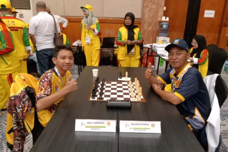 TEROPONGPUBLIK.CO.ID-Kontingen Bengkulu sedang merayakan kemenangan yang tak terduga setelah seorang atlet remaja berusia 15 tahun, Adly Juandra, mengukir prestasi gemilang di cabang olahraga catur dalam Pekan Olahraga Wilayah (PORWIL) XI Sumatera. Adly Juandra, siswa SMPN 1 Kota Bengkulu, tampil sebagai bintang dengan meraih medali emas pertama bagi kontingen Bengkulu di ajang ini.