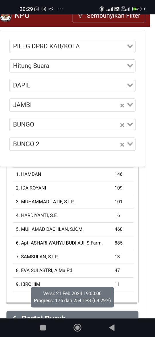TEROPONGPUBLIK.CO.ID >><< Dalam perhitungan suara Pemilihan Umum (Pemilu) yang tengah berlangsung, Apt. Ashari Wahyu Budi Aji.s Fram dari Partai Dasdem mempertahankan posisi teratasnya di Dapil Dua Kabupaten Bungo. Dengan capaian sebesar 75 persen dari total perolehan suara yang telah direkapitulasi oleh Komisi Pemilihan Umum (KPU), Ashari Wahyu terus memimpin di wilayah pemilihan yang mencakup Kecamatan Pelapat dan Kecamatan Pelapat Ilir.