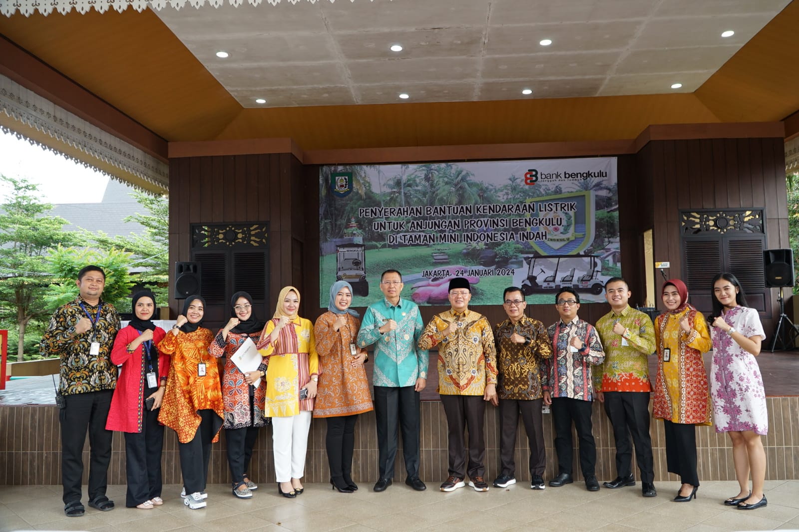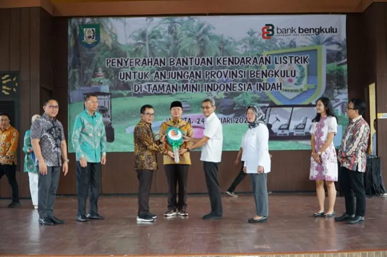 TEROPONGPUBLIK.CO.ID <<<>> Direktur Bank Bengkulu Cabang Jakarta, dalam upaya mendukung keberlanjutan lingkungan dan mengikuti instruksi presiden terkait penggunaan kendaraan berbasis listrik, menyerahkan kendaraan listrik kepada Anjungan Daerah Provinsi Bengkulu di Taman Mini Indonesia Indah (TMII). Penyerahan secara simbolis ini berlangsung pada Rabu, 24 Januari 2024, dan disambut oleh Kepala Badan Penghubung Daerah Provinsi Bengkulu, Arif Munandar. Gubernur Bengkulu, Rohidin Mersyah, turut menyaksikan momen penting ini.