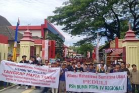 TEROPONGPUBLIK.CO.ID.MEDAN - Aksi Mahasiswa Sumatera Utara (AMSU) melakukan protes di depan Mapolda Sumatera Utara, m