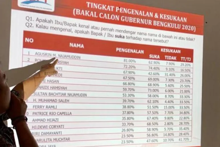 Survei dilakukan mulai 20-27 Juli 2019 di 10 kota/kabupaten di Provinsi Bengkulu dengan melibatkan 600 orang responden yang berusia 17 tahun atau lebih ata sudah menikah ketika survey dilakukan. Adapun margin of eror sebesar 4,0 persen dengan tingkat kepercayaan 95 persen. Dari hasil survey tersebut, sejumlah nama bermunculan.