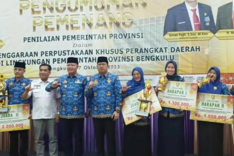 TEROPONGPUBLIK.CO.ID >><< Gubernur Bengkulu, Rohidin Mersyah, mendorong tiap-tiap Organisasi Perangkat Daerah (OPD) untuk membangun perpustakaan sebagai langkah nyata dalam meningkatkan tingkat literasi di wilayahnya. Hal ini disampaikan Gubernur Rohidin ketika memberikan penghargaan kepada pemenang dalam perlombaan "Perpustakaan Khusus Perangkat Daerah di Lingkungan Pemerintah Provinsi Bengkulu," yang diselenggarakan oleh Dinas Perpustakaan dan Kearsipan Provinsi Bengkulu di Hotel Bougenville pada Selasa (17/10/2023).
