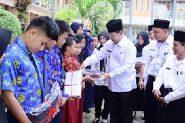 Pembagian bantuan bahan seragam sekolah gratis ini diserahkan langsung secara simbolis oleh Bupati Rejang Lebong, Ahmad Hijazi, serta didampingi oleh Kepala Dinas Pendidikan dan Kebudayaan Kabupaten Rejang Lebong, Tarsisius Samuji, dan sejumlah pejabat OPD di halaman SMP Negeri 1 Curup,
