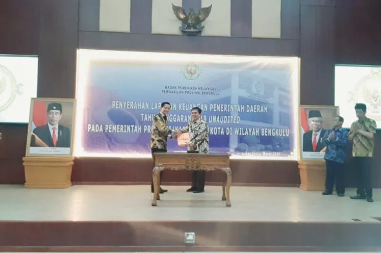 KAUR.TEROPONGPUBLIK.COM>><< Bupati Kaur Gusril Pausi, S.Sos, MAP yang didampingi Kepala BKD Alian Suhadi, S.Pd dan Kepala Inspektorat Tree Marnope Pada Jumat (13/3/2020) menyerahkan Laporan Keuangan Pemerintah Daerah (LKPD) Tahun 2019 Unaudited ( belum diaudit ) di Gedung BPK Perwakilan Wilayah Bengkulu. Dalam acara ini dihadiri juga oleh Gubernur Bengkulu DR. H. Rohidin Mersyah, Wawalkot, dan seluruh Bupati-Wabup se - Provinsi Bengkulu.
