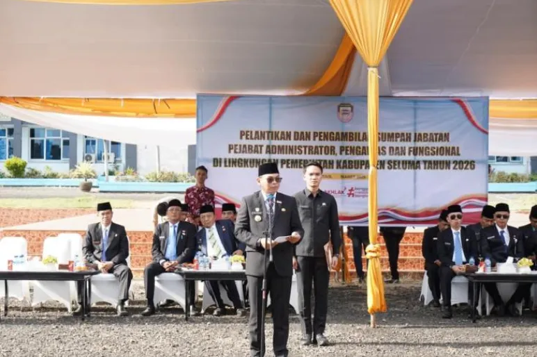 TEROPONGPUBLIK.CO.ID – Pemerintah Kabupaten Seluma kembali melakukan penataan struktur organisasi pemerintahan melalui pelantikan dan pengambilan sumpah jabatan sejumlah aparatur sipil negara (ASN). Kegiatan tersebut dipimpin langsung oleh Bupati Seluma, Teddy Rahman, SE., M.M., yang melantik pejabat administrator, pengawas, serta pejabat fungsional di lingkungan Pemkab Seluma. Prosesi pelantikan berlangsung di halaman Kantor Bupati Seluma pada Kamis (26/3/2026).