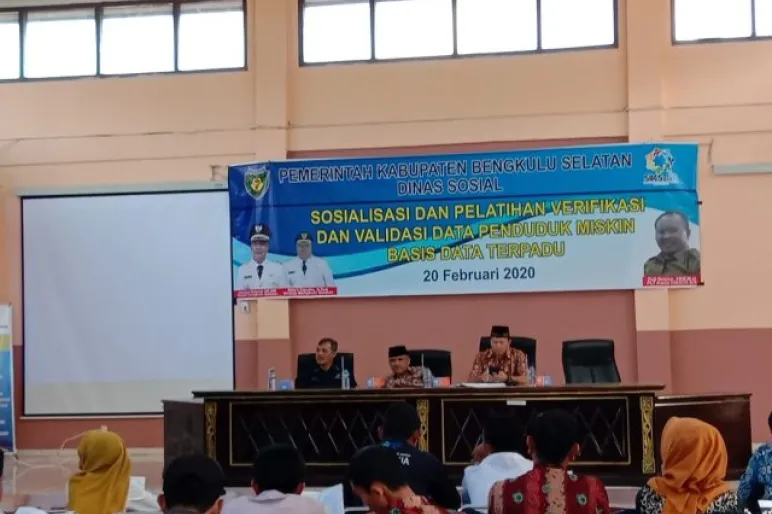 BENGKULU SELATAN.TEROPONGPUBLIK.COM>><<– Dinas Sosial Kabupaten Bengkulu Selatan menggelar Sosialisasi dan Pelatihan Verifikasi dan Validasi Data Penduduk Miskin Basis Data Terpadu.Kegiatan digelar di Aula Bappeda dan Litbang Bengkulu Selatan, Kamis (20/2/2020).