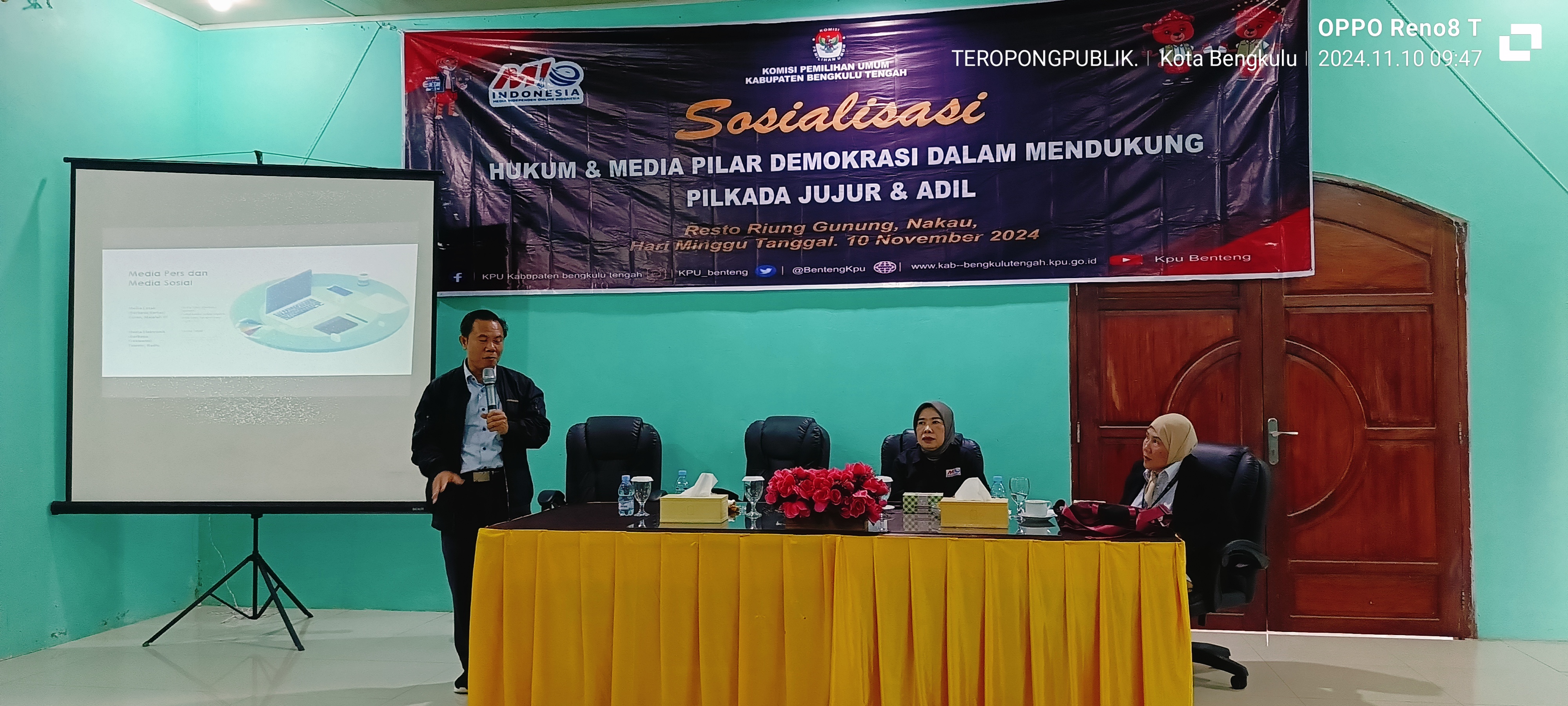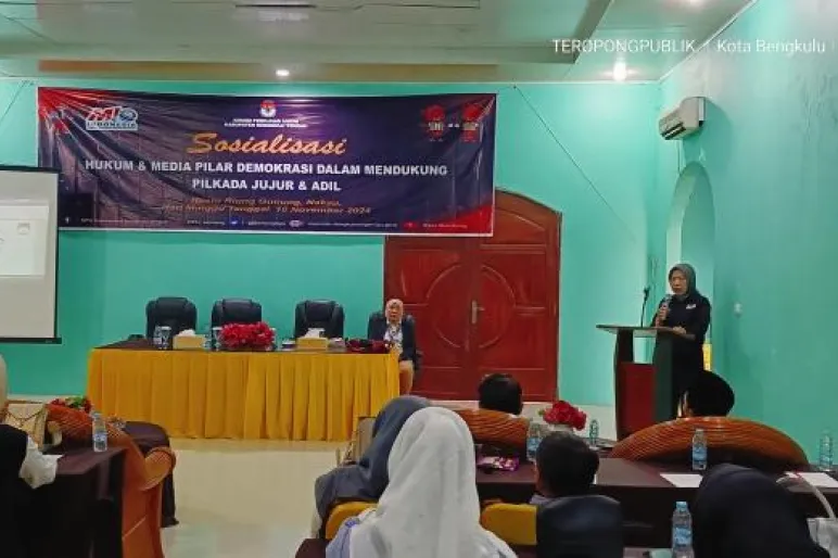 TEROPONGPUBLIK.CO.ID - Komisi Pemilihan Umum (KPU) Kabupaten Bengkulu Tengah menggelar sosialisasi Pilkada bersama Media Independent Online (MIO) Indonesia Provinsi Bengkulu di Resto Riung Gunung, Nakau, Kabupaten Bengkulu Tengah, pada Minggu, 10 November 2024. Sosialisasi ini mengusung tema "Hukum dan Media sebagai Pilar Demokrasi dalam Mendukung Pilkada Jujur dan Adil."