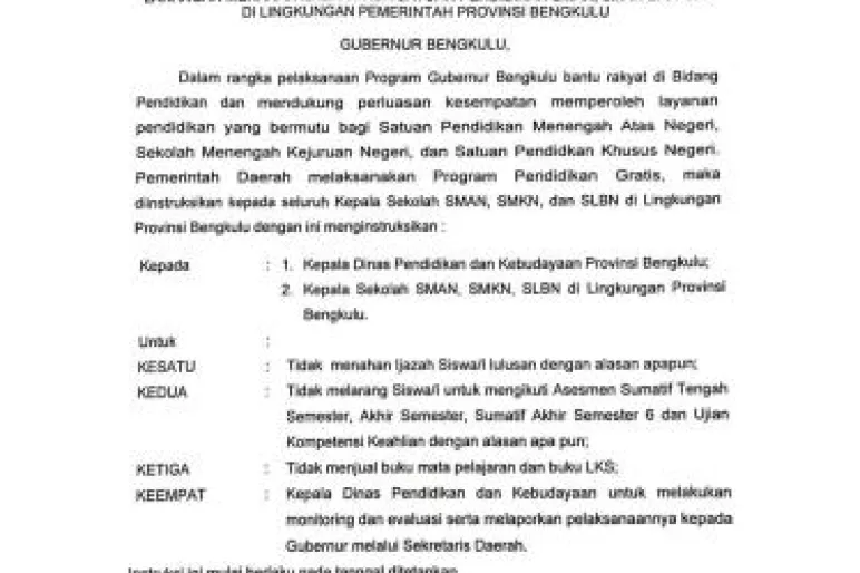 Sementara itu, Kepala Dinas Pendidikan dan Kebudayaan Provinsi Bengkulu, Drs. Ridwan, M.Pd., menyatakan pihaknya sudah menyampaikan instruksi gubernur ke seluruh sekolah. Ia juga mengimbau orang tua dan siswa untuk segera melapor jika masih ada ijazah yang ditahan.