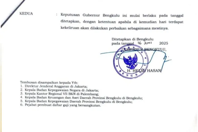 Sebagai bentuk tindak lanjut administratif, keputusan pemberhentian ini telah disampaikan kepada sejumlah lembaga dan instansi terkait, termasuk Badan Kepegawaian Negara (BKN), Kementerian Keuangan, dan Badan Kepegawaian Daerah (BKD) Provinsi Bengkulu.