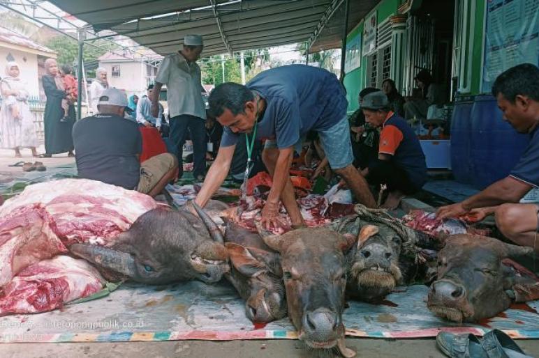 Setelah khotbah selesai,Ketua Masjid Awaludin H.Bastari Marzuki membacakan daftar warga yang berkurban pada Idul Adha 1443 H. Total ada 6 hewan kurban dengan rincian 2 ekor Kerbau dan 3 Ekor Sapi,1 ekor Kambing.
