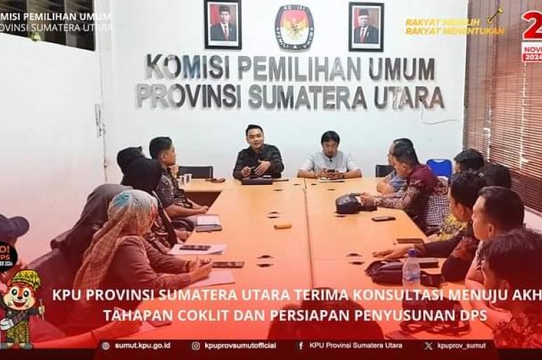 TEROPONGPUBLIK.CO.ID - Komisi Pemilihan Umum (KPU) Provinsi Sumatera Utara menerima kunjungan konsultasi dari KPU-KPU kabupaten dan kota dalam rangka mempertajam tahapan coklit dan penyusunan Daftar Pemilih Sementara (DPS) untuk Pilkada Serentak 2024. Konsultasi ini berlangsung pada hari Jumat (19/07/2024) di Aula KPU Provinsi Sumatera Utara.