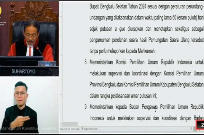 TEROPONGPUBLIK.CO.ID - Mahkamah Konstitusi Republik Indonesia (MKRI) resmi memutuskan sengketa hasil Pemilihan Umum Bupati dan Wakil Bupati Bengkulu Selatan Tahun 2024. Dalam sidang yang digelar di Gedung MKRI, Jakarta, Ketua MK Suhartoyo membacakan amar putusan yang mengabulkan sebagian permohonan pasangan calon Rifai dan Yevri Sudianto.