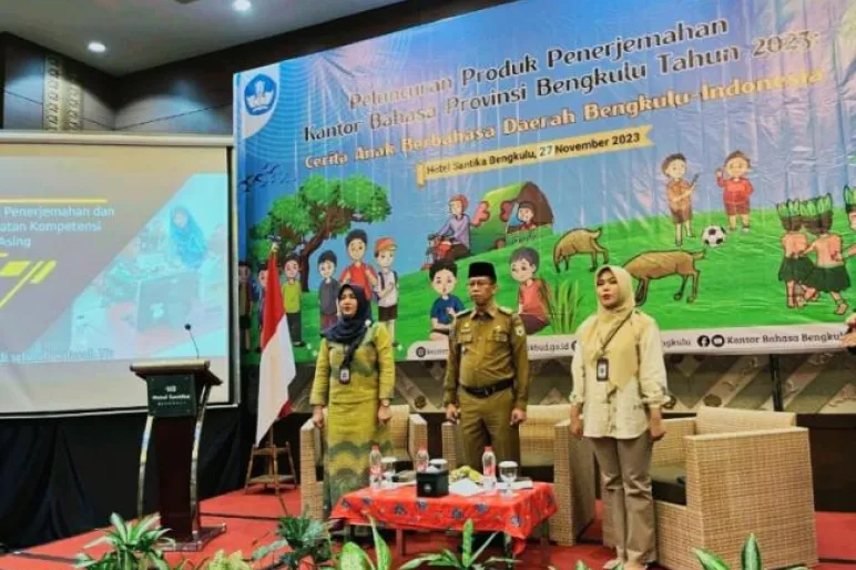 TEROPONGPUBLIK.CO.ID -Kantor Bahasa Provinsi Bengkulu melalui Kelompok Kepakaran dan Layanan Profesional (KKLP) Penerjemahan melaksanakan Peluncuran Produk Penerjemahan Kantor Bahasa Provinsi Bengkulu Tahun 2023: Buku Cerita Anak Berbahasa Daerah Bengkulu-Indonesia. Kegiatan ini dilaksanakan di Aula Hotel Santika, Bengkulu dan diikuti oleh 80 peserta dari lembaga pemerintahan, lembaga Pendidikan, perguruan tinggi, lembaga penyiaran, penulis, dan pegiat literasi di Provinsi Bengkulu.