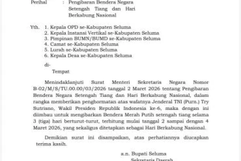 TEROPONGPUBLIK.CO.ID - Pemerintah Kabupaten Seluma mengeluarkan imbauan resmi kepada seluruh lembaga pemerintahan serta instansi terkait untuk mengibarkan Bendera Merah Putih setengah tiang sebagai bentuk penghormatan atas wafatnya tokoh nasional, Try Sutrisno, yang pernah menjabat sebagai Wakil Presiden Republik Indonesia ke-6. Kebijakan tersebut berlaku selama tiga hari berturut-turut, mulai 2 hingga 4 Maret 2026.