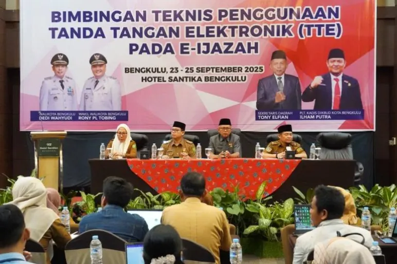 TEROPONGPUBLIK.CO.ID <<<>>>> Pemerintah Kota Bengkulu melalui Dinas Pendidikan dan Kebudayaan (Dikbud) menggelar Bimbingan Teknis (Bimtek) Penggunaan Tanda Tangan Elektronik (TTE) pada E-Ijazah sekolah. Acara ini resmi dibuka oleh Penjabat (Pj) Sekretaris Daerah Kota Bengkulu, Tony Elfian, di Hotel Santika Kota Bengkulu, Selasa (23/9/2025). Kegiatan yang berlangsung selama tiga hari, mulai 23 hingga 25 September 2025, diikuti oleh kepala sekolah, operator, serta tenaga administrasi dari berbagai jenjang pendidikan di Kota Bengkulu.