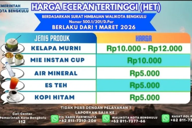 TEROPONGPUBLIK.CO.ID – Pemerintah Kota Bengkulu resmi mengeluarkan surat imbauan terkait penetapan harga eceran sejumlah produk di kawasan wisata Pantai Panjang. Kebijakan ini tertuang dalam Surat Imbauan Walikota Bengkulu Nomor 500.1/201/D.Par yang mulai berlaku sejak 1 Maret 2026.