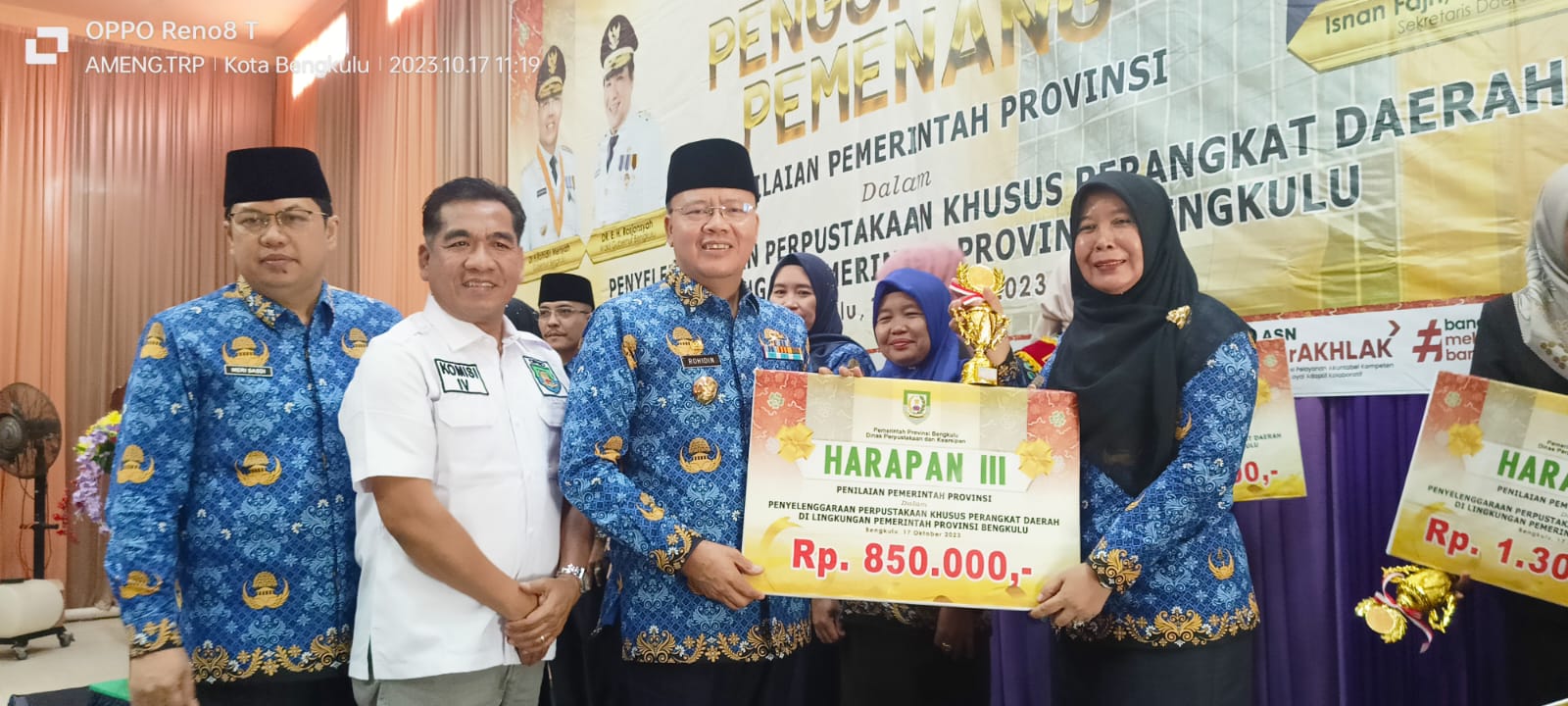 Teropongpublik.co.id >><< Dinas Perpustakaan dan Kearsipan Provinsi Bengkulu menggelar acara istimewa di Hotel Grand Bougenville, Pantai Panjang, Kota Bengkulu. Acara tersebut adalah penyerahan hadiah kepada pemenang dalam penyelenggaraan Perpustakaan Khusus Perangkat Daerah di lingkungan pemerintahan Provinsi Bengkulu. Acara ini menjadi momentum bersejarah bagi para pegiat perpustakaan daerah dalam meningkatkan kualitas layanan perpustakaan di wilayah provinsi Bengkulu.Selasa.17/10/2023.