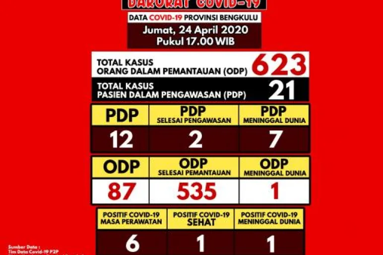 Untuk diketahui, berdasarkan update per 24 April 2020, kasus konfirmasi Covid-19 di Provinsi Bengkulu tercatat 8 orang. 1 dinyatakan sembuh, 2 orang isolasi mandiri dan 4 orang dalam perawatan RS. Sedangkan 1 orang lagi merupakan pasien 01 konfirmasi Covid-19 yang telah meninggal dunia.