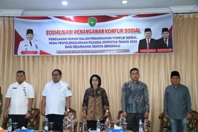 TEROPONGPUBLIK.CO.ID <<<>>> Dalam upaya memastikan Pilkada Serentak 2024 berjalan dengan aman dan kondusif, Badan Kesatuan Bangsa dan Politik (Kesbangpol) Kota Bengkulu menggelar sosialisasi tentang penegakan hukum terkait penanganan konflik sosial pada Jumat (25/10) di Hotel Vista. Kegiatan ini bertujuan untuk meningkatkan kesadaran masyarakat dan aparat penegak hukum serta semua elemen yang terlibat dalam proses pemilihan agar mampu menjaga kondusivitas daerah dan mencegah terjadinya konflik.