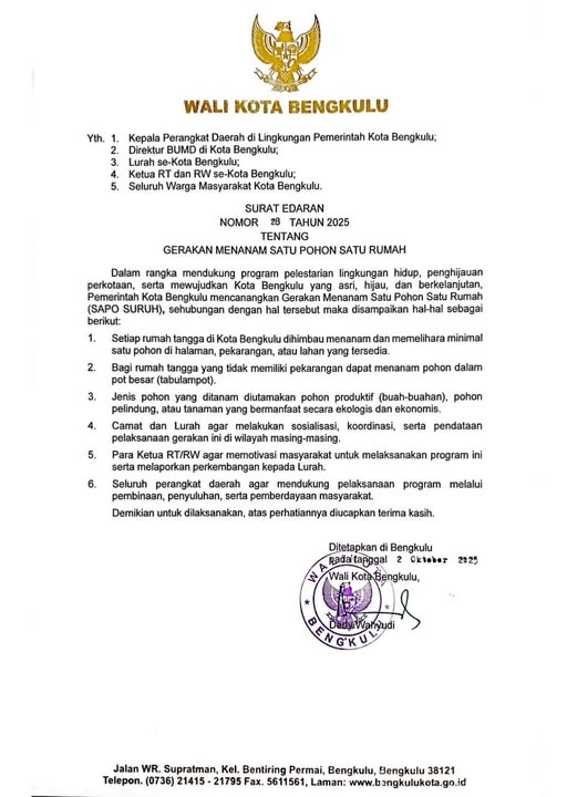 Dengan diterbitkannya Surat Edaran Nomor 28 Tahun 2025 ini, Pemkot Bengkulu berharap gerakan *Satu Pohon Satu Rumah* tidak hanya menjadi program sementara, melainkan menjadi kebiasaan dan budaya masyarakat dalam menjaga lingkungan.