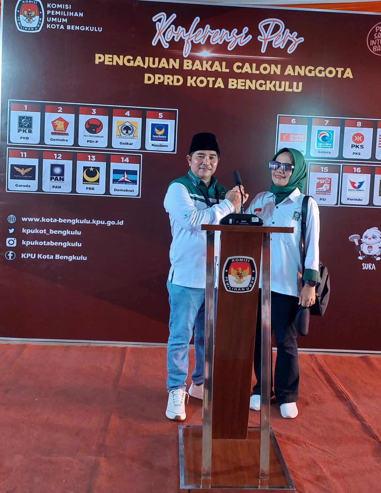 Yosi marlina,SE mendampingi Ketua DPC Partai Kebangkitan Bangsa, Iswandi Ruslan, S.Sos datang ke Kantor Komisi Pemilihan Umum (KPU) Kota Bengkulu bersama pengurus mengantarkan berkas dan mendaftarkan 35 calon legislatif (Caleg) DPRD Kota Bengkulu di pemilu 2024 mendatang